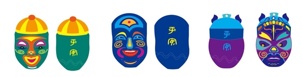 視覺(jué)傳達(dá)設(shè)計(jì)專業(yè)的袁丹青在創(chuàng)作時(shí)同樣遇到了困難。她選擇在作品中將傳統(tǒng)民族文化與當(dāng)代時(shí)尚文化相結(jié)合,但兩者客觀存在的差異使她在創(chuàng)作時(shí)不知從何下手。經(jīng)過(guò)長(zhǎng)時(shí)間的思考,她最終決定將自己的畢業(yè)作品定為儺戲面具。在保留儺戲人物傳統(tǒng)外貌特征的同時(shí),又注意對(duì)每個(gè)人物不同性格的刻畫(huà),并通過(guò)給人物的臉頰增添魚(yú)尾紋樣等元素,使它們的形象更加有趣可愛(ài)。